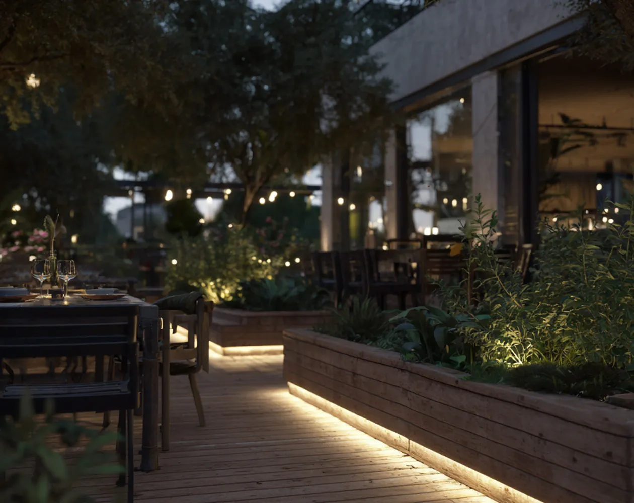 L'éclairage extérieur est essentiel tant pour la sécurité que l'apparence d'un bâtiment commercial. Il offre non seulement une meilleure visibilité mais renforce également l'image de marque de votre client. Le bon emplacement de l'éclairage extérieur garantit la sécurité, la mise en valeur de l'enseigne sur la façade et la création d'une ambiance agréable dans l'établissement. Il existe un luminaire adapté à chaque utilisation. Nous proposons de l'éclairage de sécurité, des lampes d'extérieur classiques et modernes ou bien des guirlandes lumineuses. L'installation de l'éclairage extérieur intelligent améliore la facilité d'utilisation et l'efficacité énergétique chez votre client.