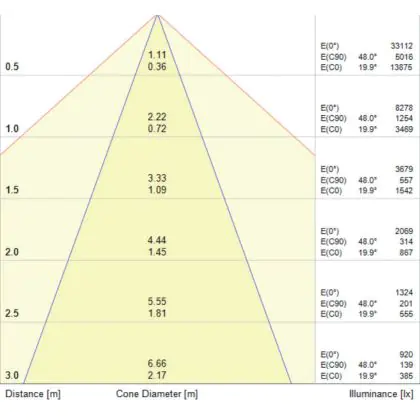 De gradenbundel geeft informatie over hoe breed het licht wordt uitgestraald. Dit zit tussen de 0 en 360 graden (D). Hoe kleiner de hoek, hoe specifieker de lichtbundel is. Over het algemeen is een smalle gradenbundel perfect voor sfeer- of accentverlichting, terwijl een brede gradenbundel ideaal is om grote oppervlaktes te verlichten.