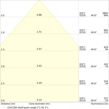 De gradenbundel geeft informatie over hoe breed het licht wordt uitgestraald. Dit zit tussen de 0 en 360 graden (D). Hoe kleiner de hoek, hoe specifieker de lichtbundel is. Over het algemeen is een smalle gradenbundel perfect voor sfeer- of accentverlichting, terwijl een brede gradenbundel ideaal is om grote oppervlaktes te verlichten.